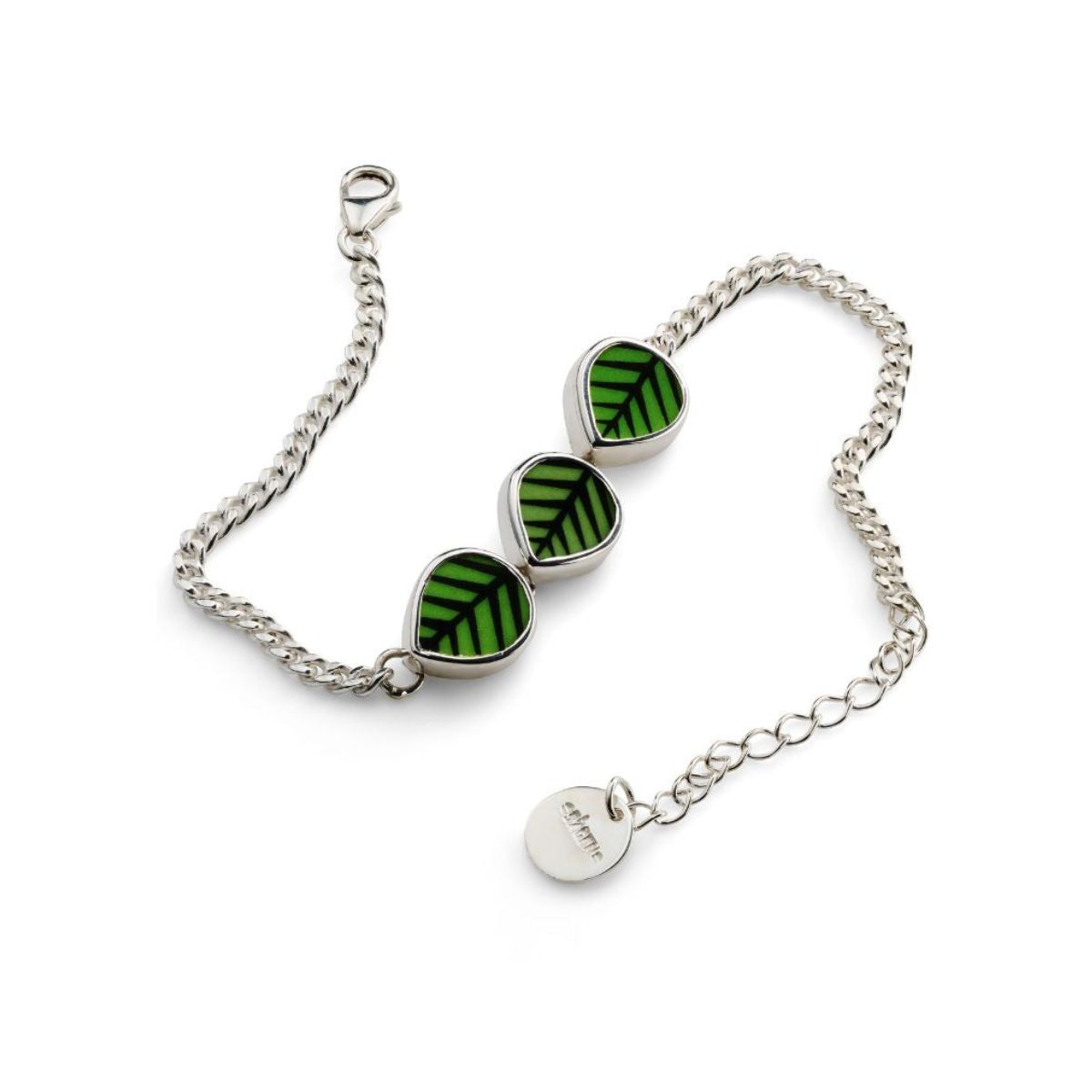 Matériel : Porcelaine recyclée et argent Taille de la porcelaine : 10x11mm Longueur du bracelet : 210mm Taille de la chaîne : 2,5x3mm, épaisseur de 0,6mm Autre : Longueur ajustable de 155 à 195mm