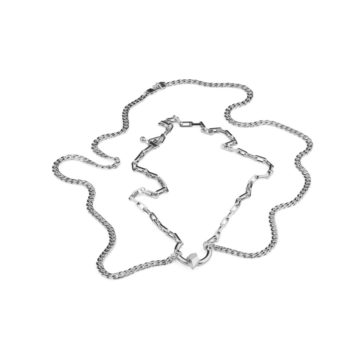Material: 80% återvunnet rostfritt stål. Nickelfritt. Toppkedjans längd: vä sida: 480mm hö sida: 300mm Toppkedjan lås: 1st på höger kedja Toppkedjan detalj: liten silverkula som avslut på vänster kedja Bottenkedjans längd: 120mm Bottenkedjan lås: 2st, kan fästas längs hela kedjan för att anpassas efter din storlek och smak Justerbar: De 3 låsen och kedjornas storlek gör att den passar alla och kan varieras, bara fantasin sätter stopp för hur du stylar den. Tipps: Kan med fördel även bäras som lager-på-lager halsband. Ringen/Stenens storlek: 40x35mm 16x20mm höjd 9mm